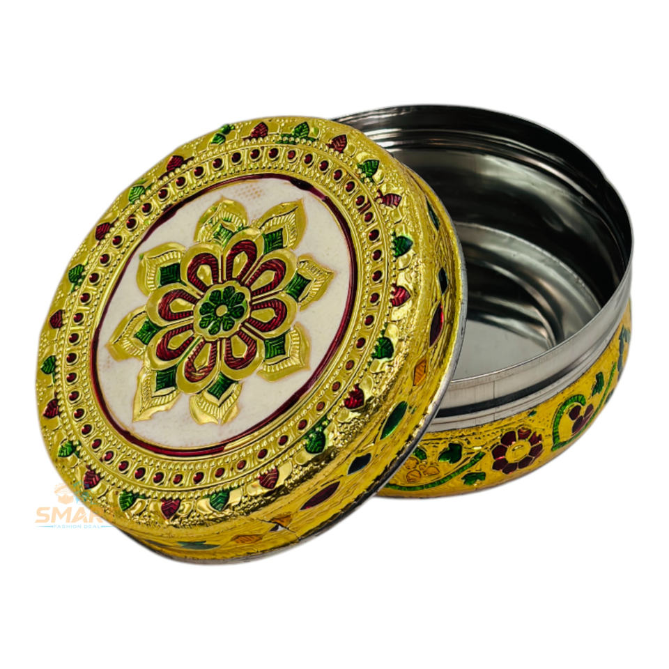 Stainless Steel Gold-Plated Round Meenakari Dibba for Home Decoration and Gifting