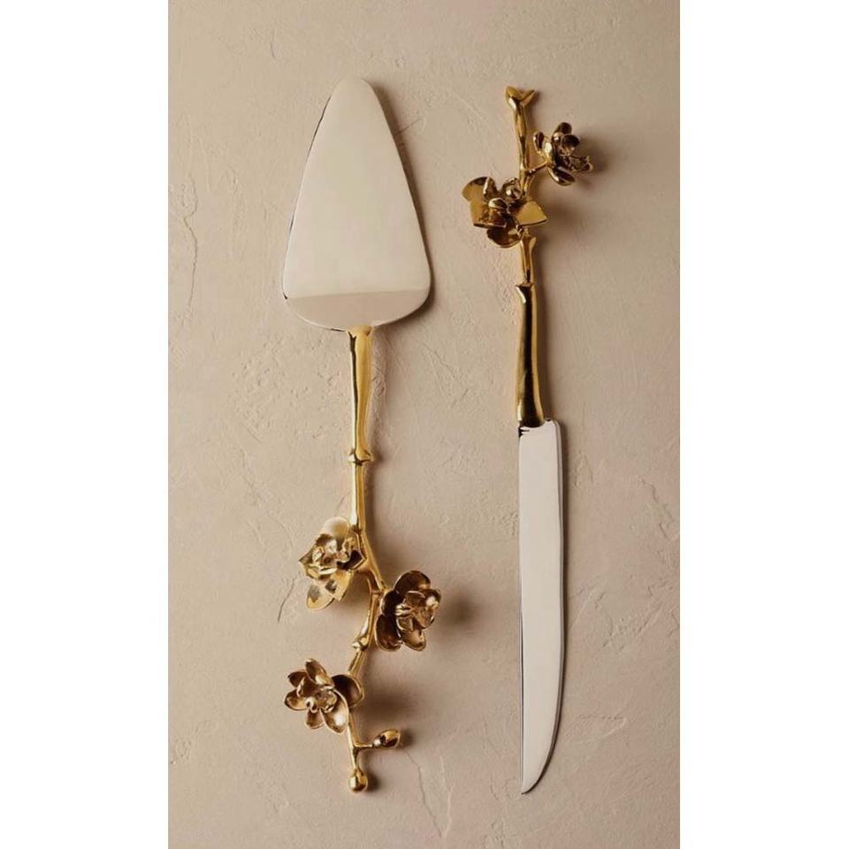 Gold Plated Stainless Steel Cake Server Set with Twig Handle Spatula & Slicer for Dessert Use Metal Material