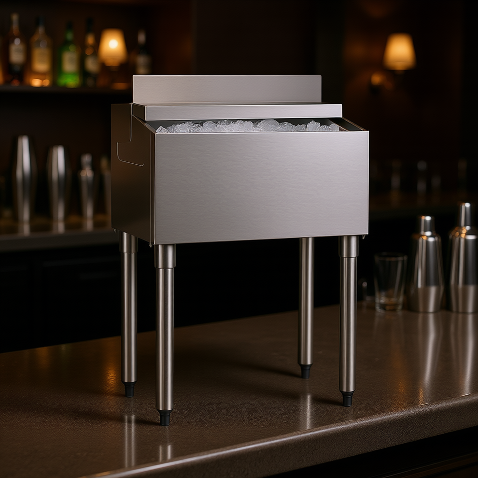 Stainless Steel Ice Bin 61 L 24 X 19 Inch Sliding Lid Adjustable Feet Cooler Cart Cocktail Party Industrial Design