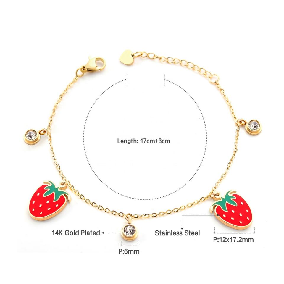 Stainless Steel Jewelry 18K Gold Plated Cute Strawberry Charm Bracelet Enamel Fruit Pendant Zircon Chain Minimalist Bracelet