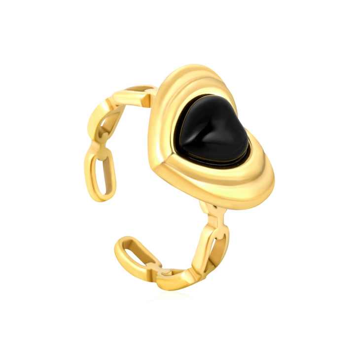 Stainless Steel Jewelry 18K Gold Plated Chunky Statement Rings Geometric Black Heart Inlay Minimalist Bold Open Ring for Women
