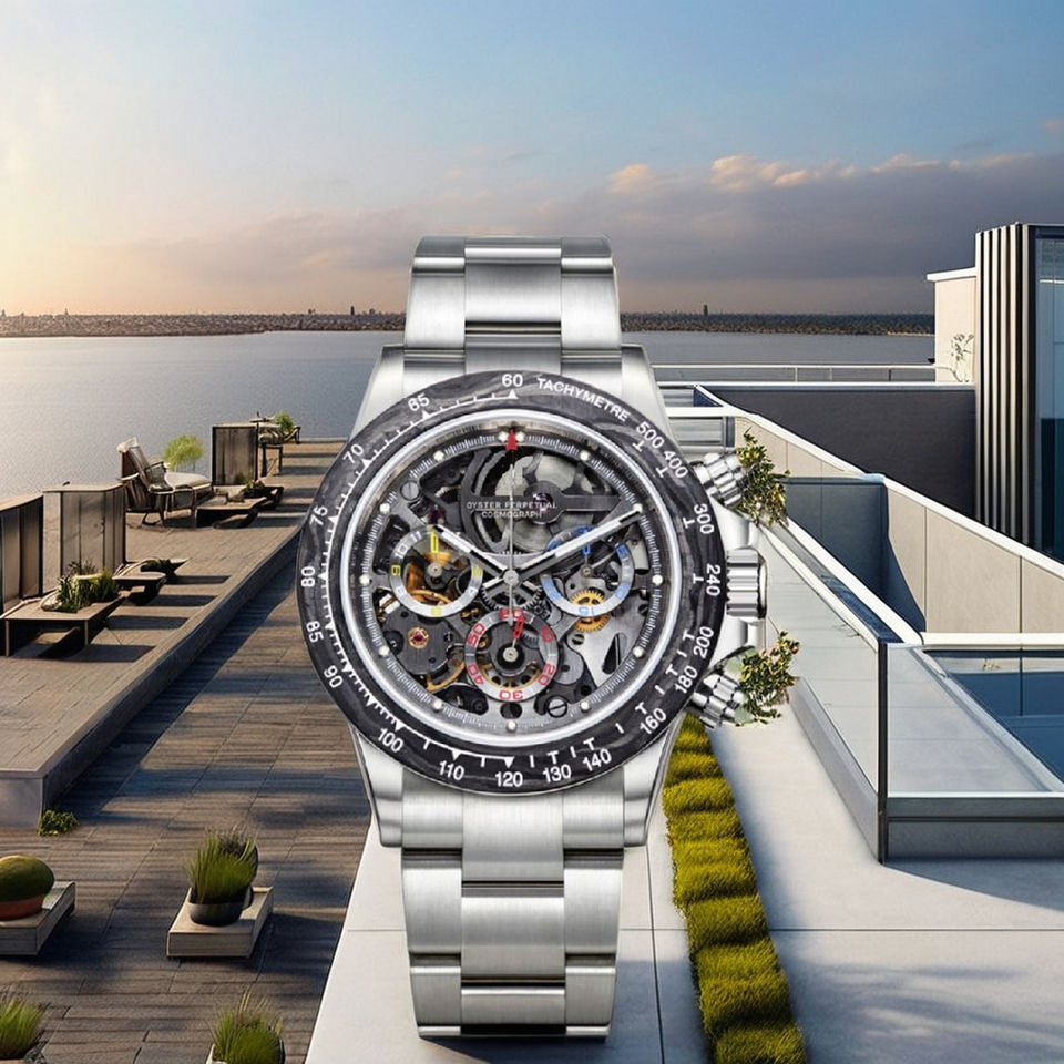 Stainless Steel Limited Edition Watch Skeleton Dial Black Carbon Tachymeter Bezel-High Quality Mechanical Luxury Hip Hop