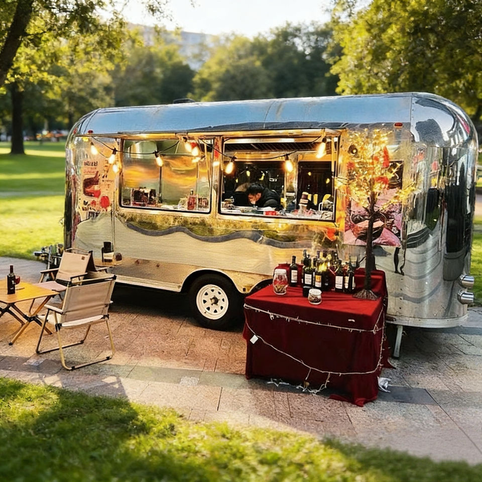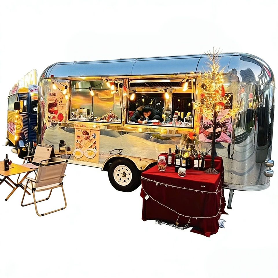 Stainless Steel Mobile Food Cart with Warm String Lights for Wine and Dessert Vending with Cozy Interior