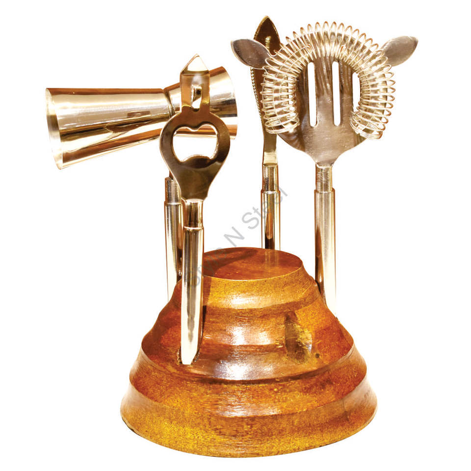 Name:Gold & Silver Cocktail Shaker 5 Pcs Bar Tool Set With Wooden Stand