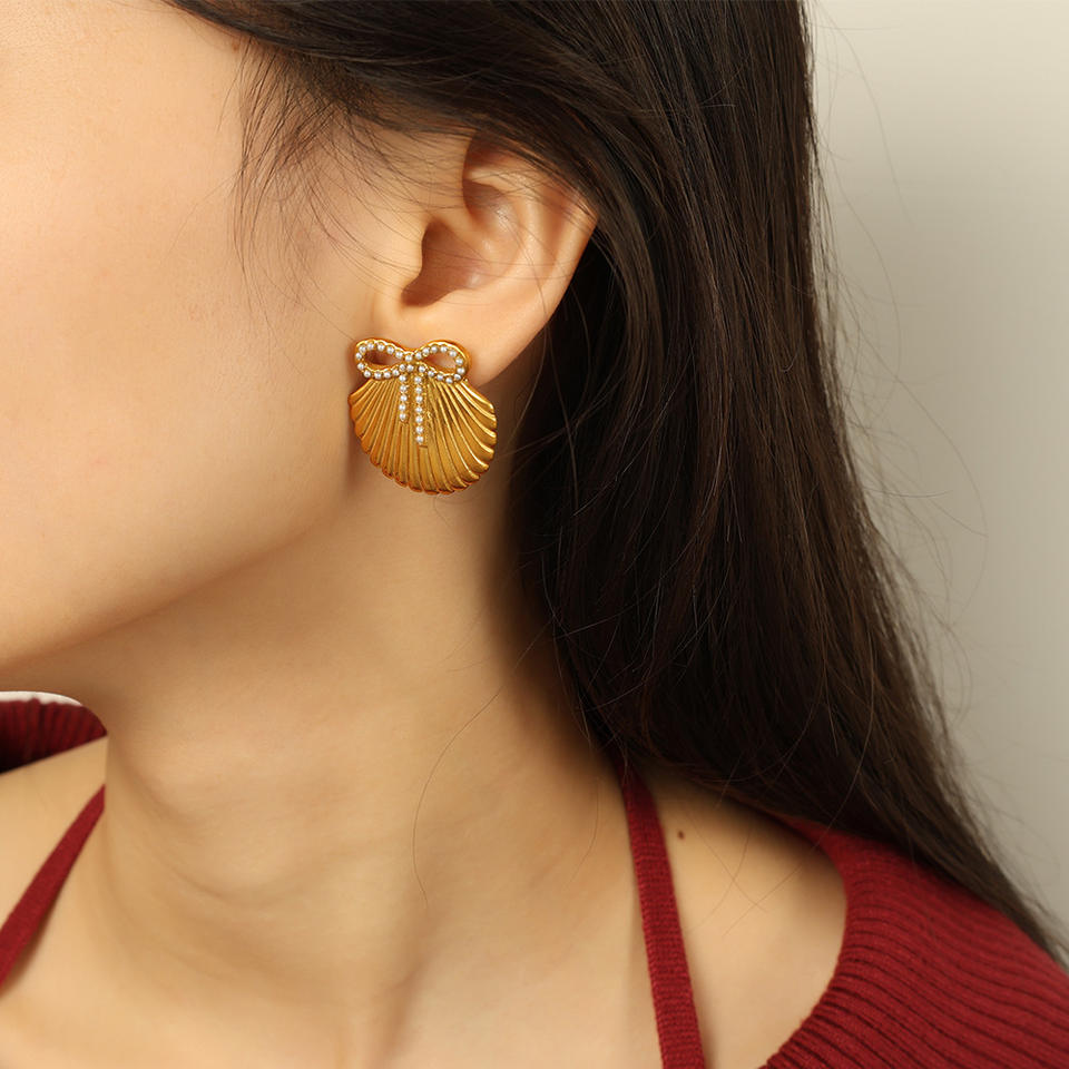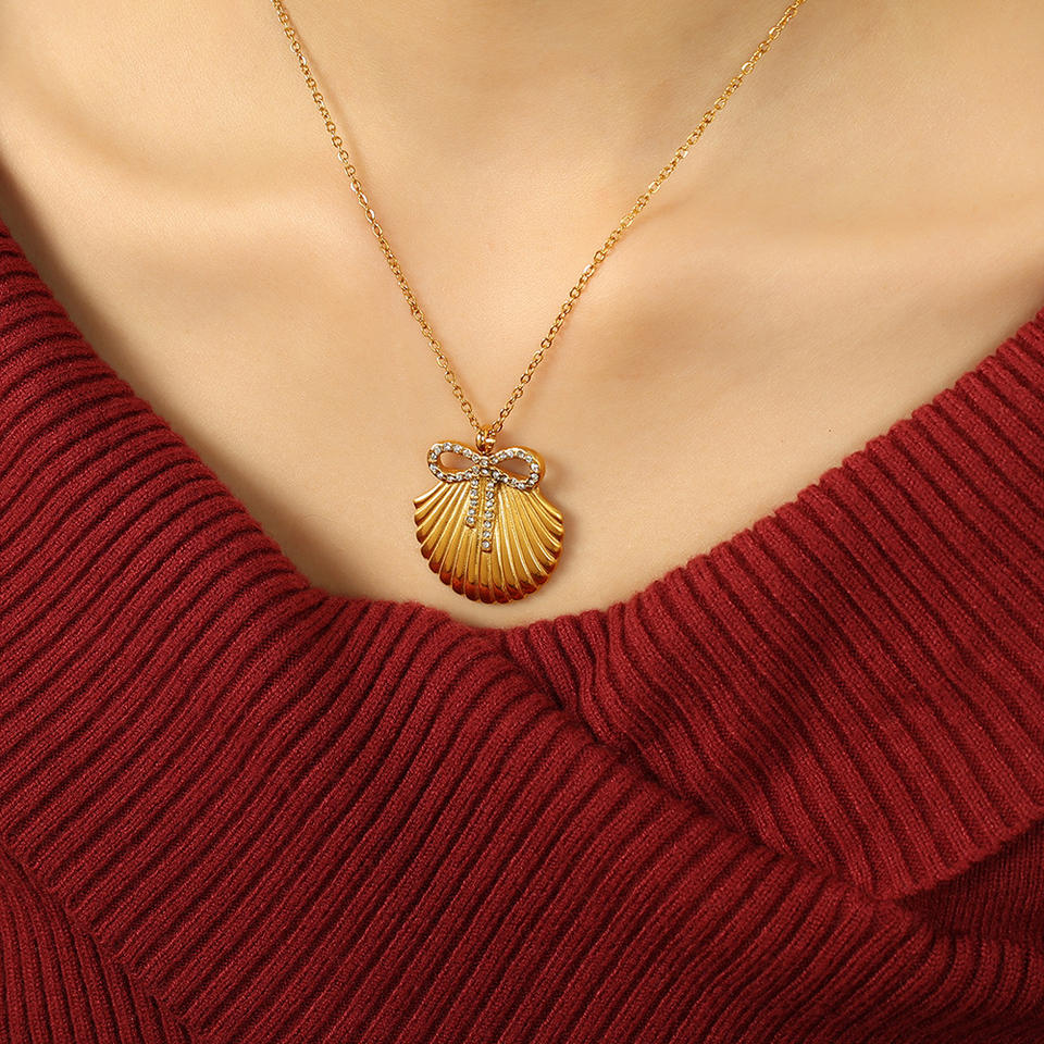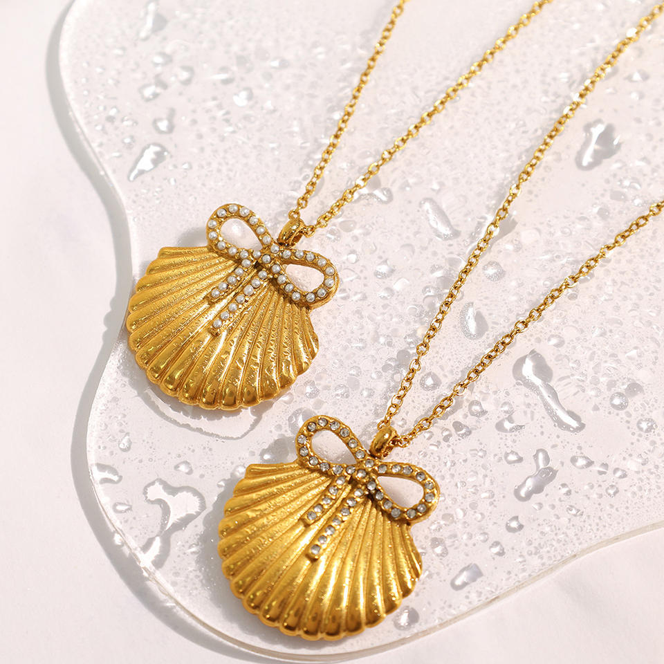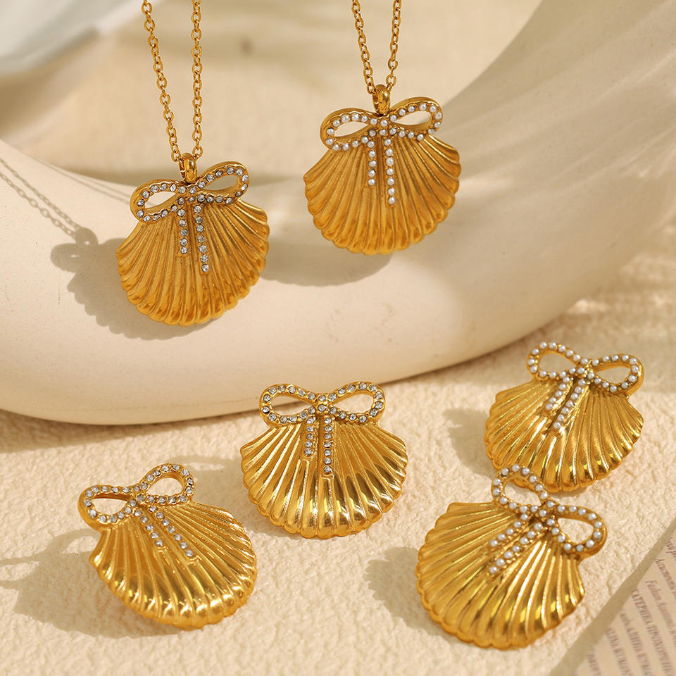 Stainless Steel Shell Bow Rhinestone Earrings And Necklace Set Women's Party Jewelry Fashion Gold Tone Crystal Claw Setting