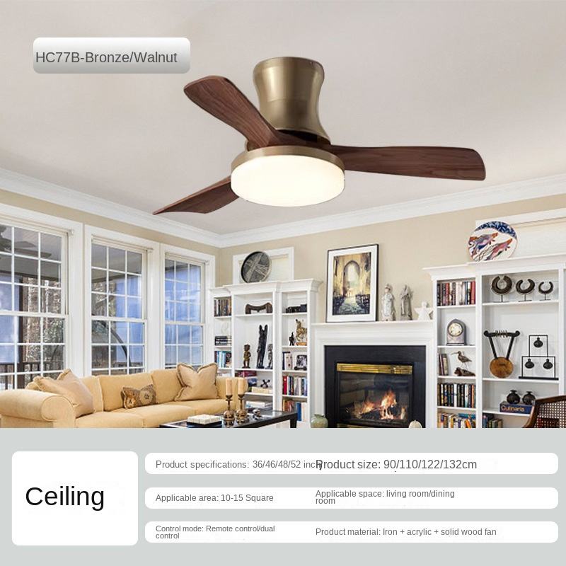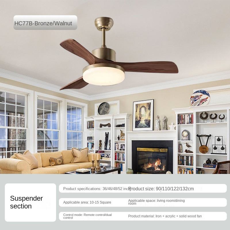 Stainless Steel Solid Wood Bedroom Indoor 3 Color Led Home Machine Winding Ceiling Light Fan