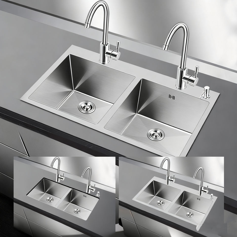 Drain hole, Stainless steel double-bowl hot and cold water fau, Handcrafted stainless steel double sink