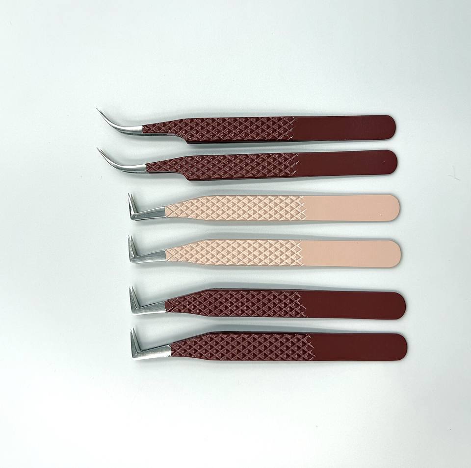 Stainless Steel painted beige & hot brown color with silver tip Lash Tweezers L Boot Fiber Tip grip Eyelash extensions Tweezers