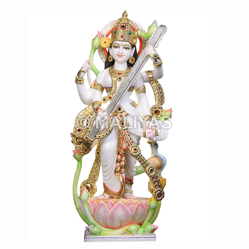 Standing Maa Saraswati Marble Murti | Handcrafted Saraswati Veena Statue for Home & Temple – Maliyas