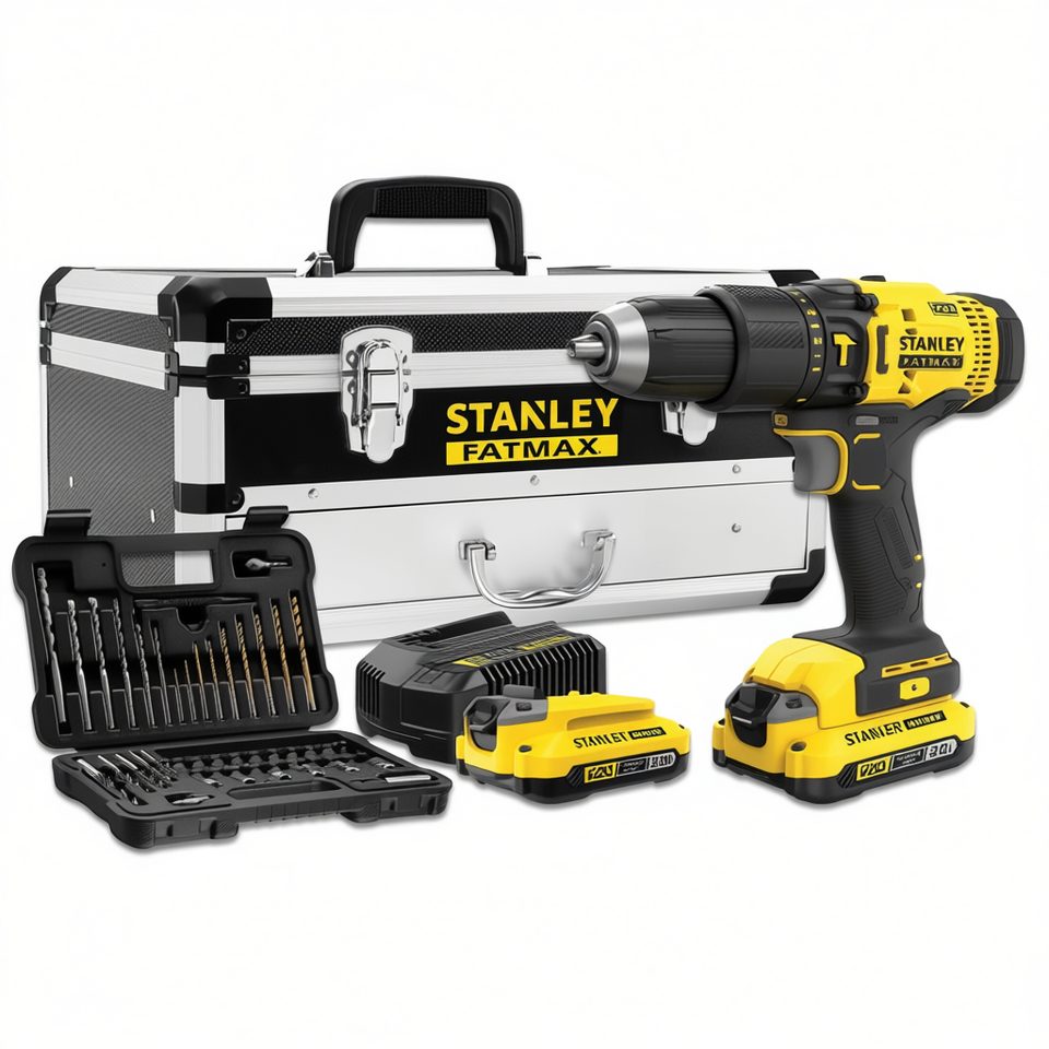 Stanley 18V Power Hammer Drill Kit with 2 X 2Ah Batteries 2A Charger 50 Bits Box and Metal Case