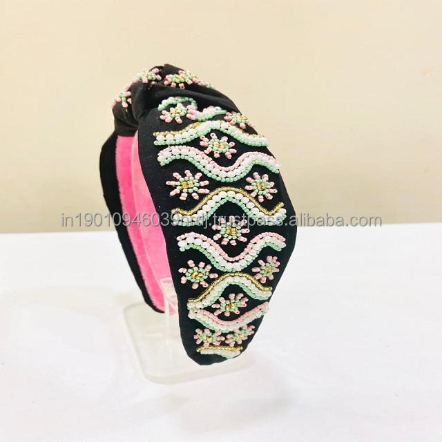 Star Design Hand Work Top Knotted Seed Beaded Crystal Bling Rhinestone Pearl Jeweled Fabric Pink Headband Teenage Girls