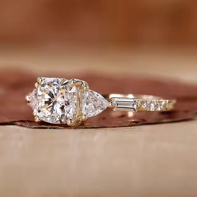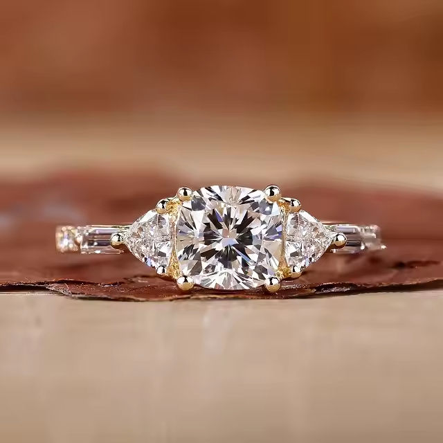 Star Dust Handmade Vintage Style Three Stone Engagement Ring Cushion Cut Moissanite Diamond Wedding Ring with Loose Diamonds