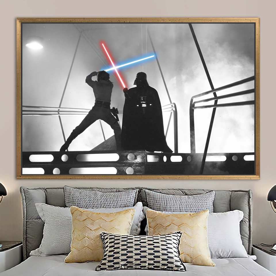 Star Wars Canvas Print: Darth Vader vs Luke Skywalker Battle Art,1P:Gold Framed