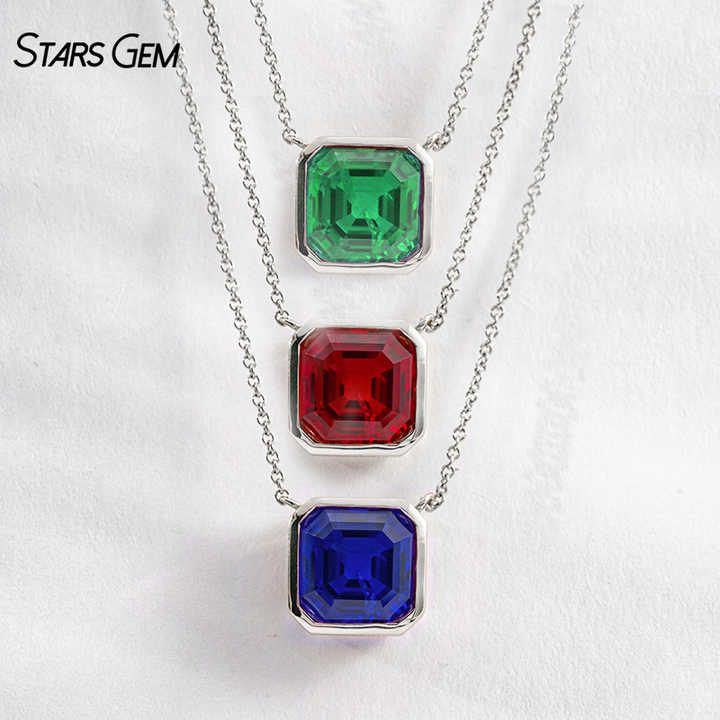StarsGem Fine Jewelry 10K Solid Gold Lab Created Ruby Asscher Cut Bezel Setting Rhodium Plated Gemstone Pendant Necklace