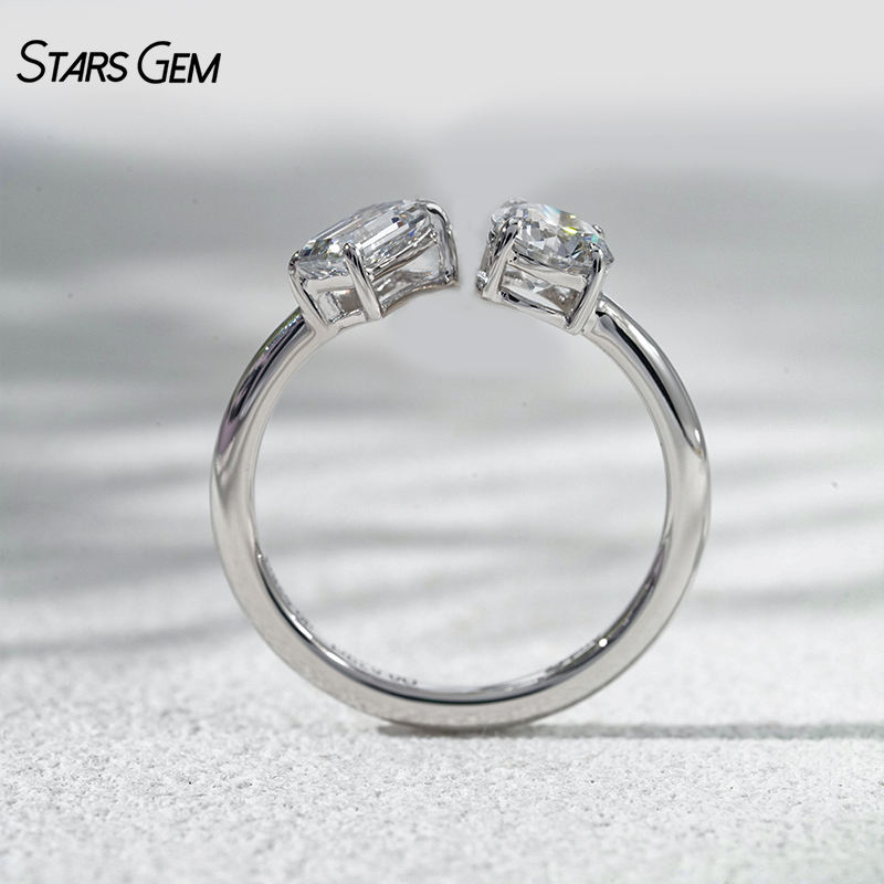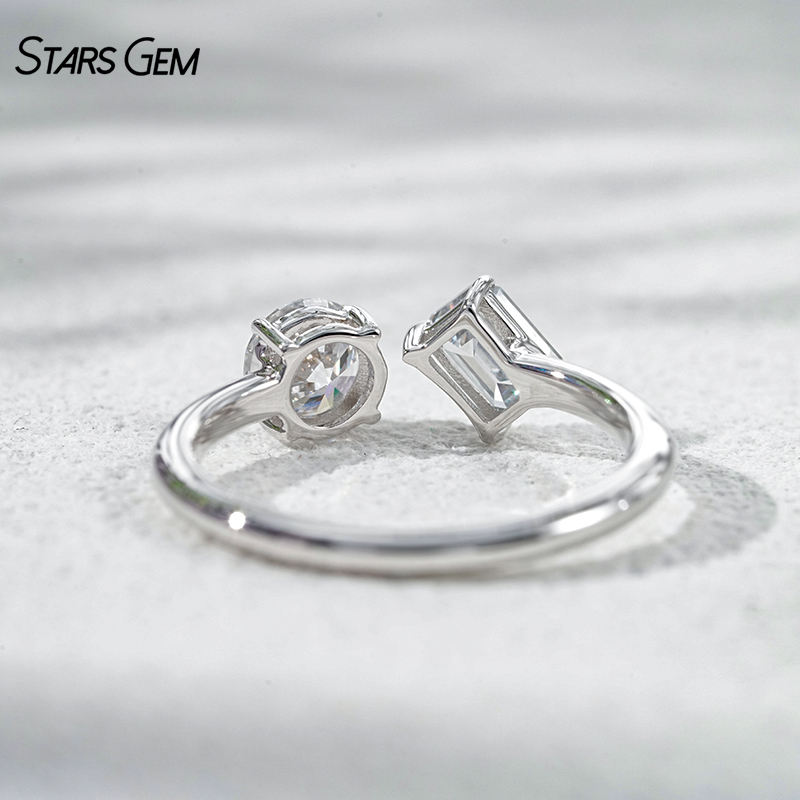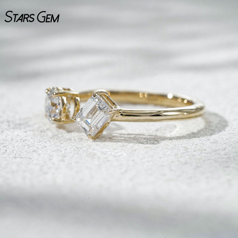 StarsGem Toi Et Moi Engagement Ring 10K Solid Gold Rhodium Plated 1.0CTW E Color Lab Diamond Emerald Cut Open Shank Adjustable