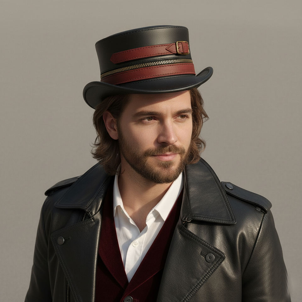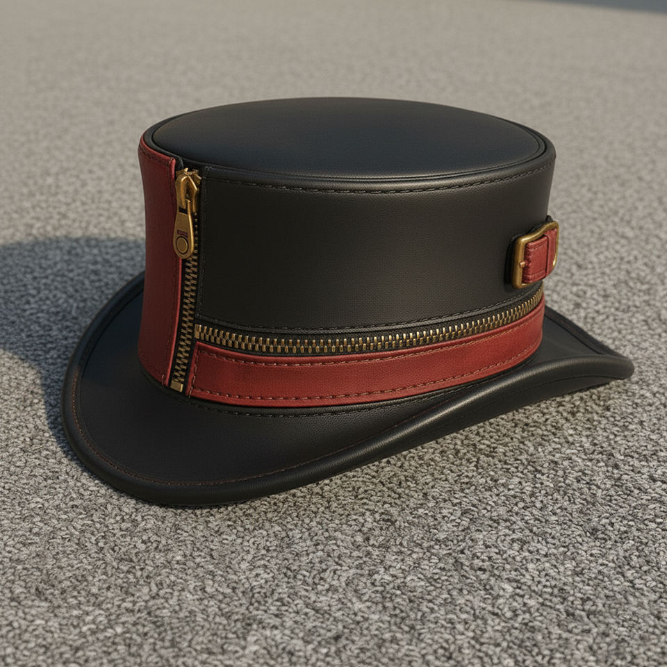 Steampunk Black & Red Handmade Leather top Hat with Brass Zipper Western Style Premium Quality Sports Business