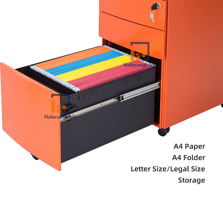 Steel A4 Storage Furniture Movable Small Mobile Pedestal 3 Orange Metal Filing Cabinets Drawers for Office Home School Hospital
