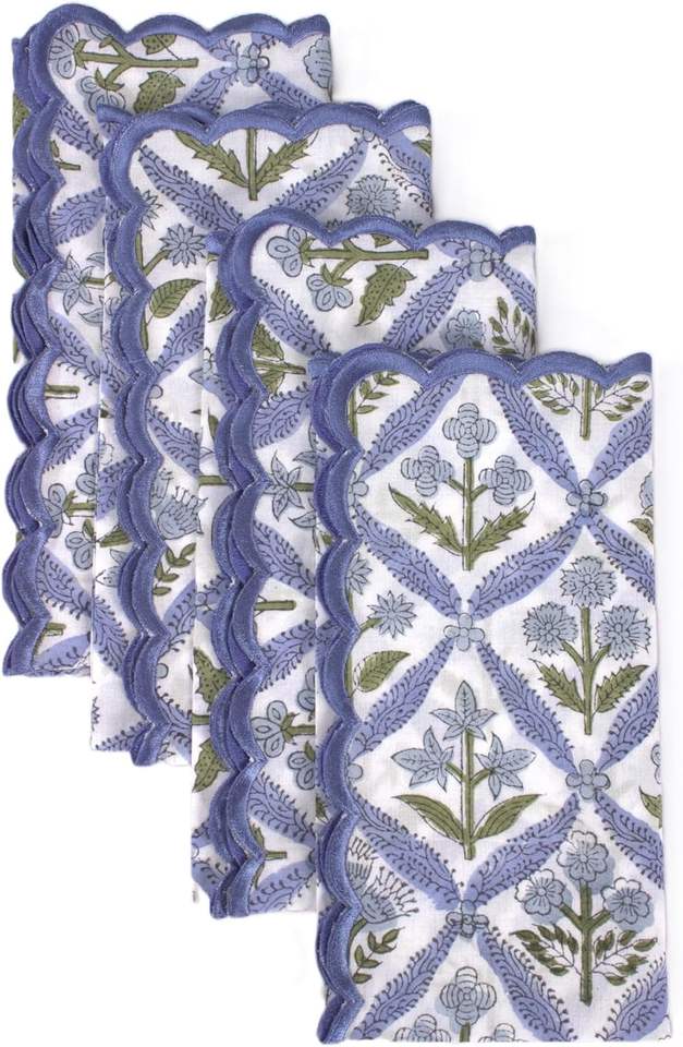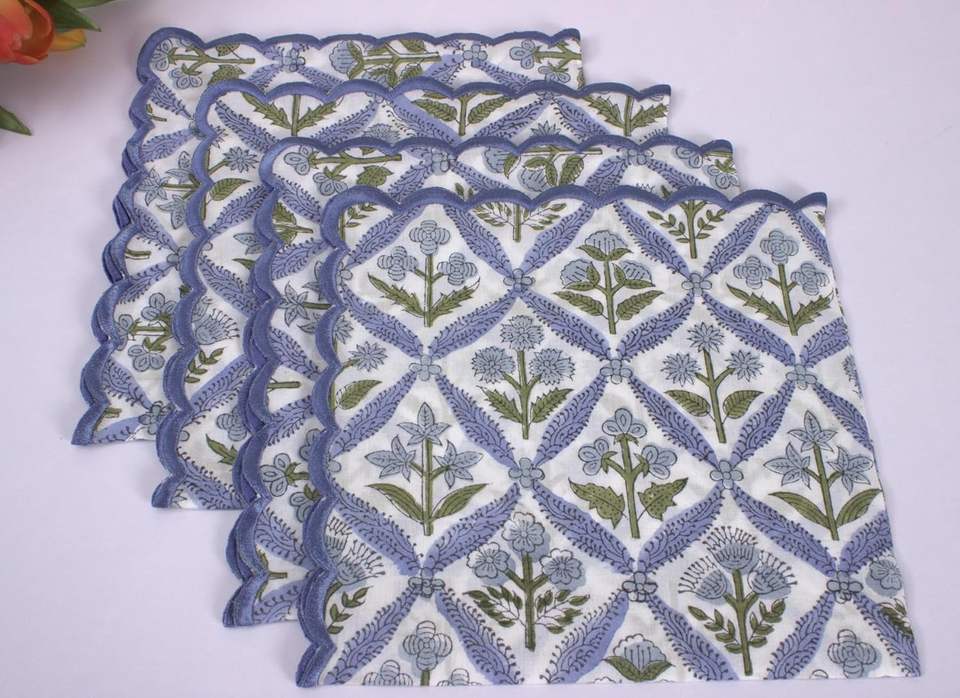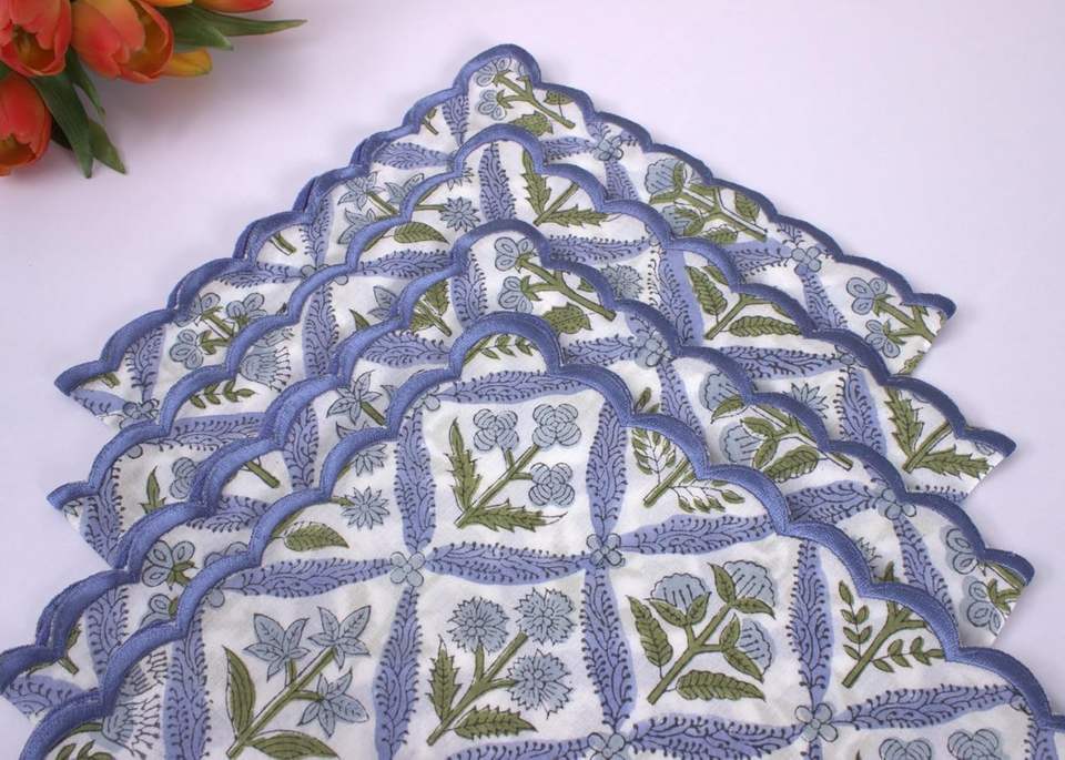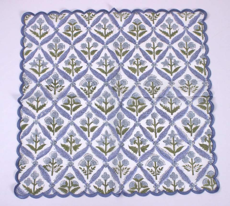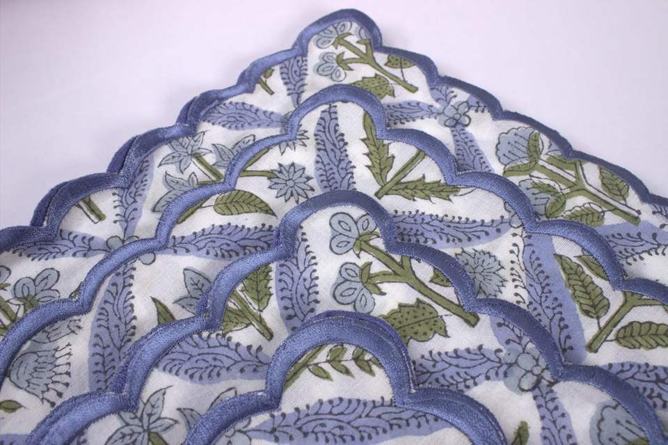 Steel Blue Embroidery Napkins Scallops Indian Floral Hand Block Printed Cotton Cloth Napkins 18X18" for Wedding Home Party