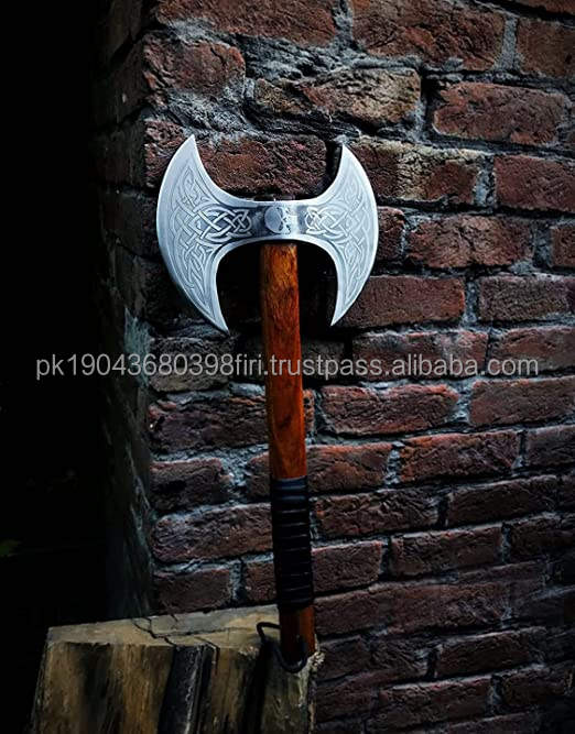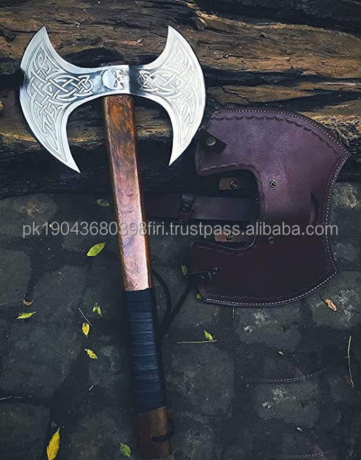 Steel Craft International High Quality Viking Double-Head Axe Hatchet Damascus Steel Blade Wood Etched Design Cutting Edge