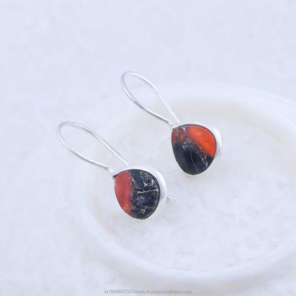 Sterling Silver Black and Orange Jade Inlay Heart Drop Earrings Boho Minimalist Jewelry for Women
