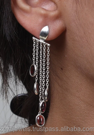 Sterling Silver Garnet Chain Cocktail Earrings Multi Strand Dangle Earrings Designer Gemstone Drop Earrings