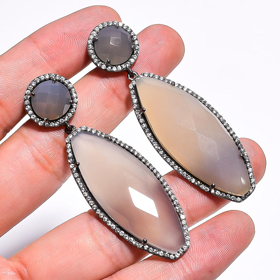 Sterling Silver Grey Chalcedony Long Drop Earrings Oval Faceted Gemstone With CZ Bezel Elegant Dangle Jewelry