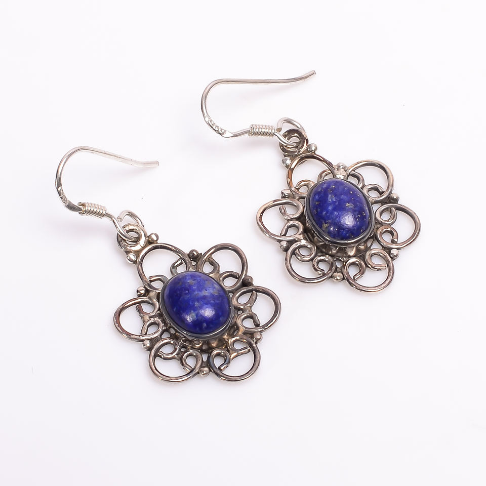 Sterling Silver Lapis Lazuli Drop Earrings Handcrafted Floral Filigree Blue Gemstone Dangle Jewelry For Women