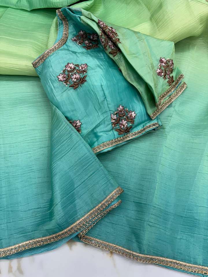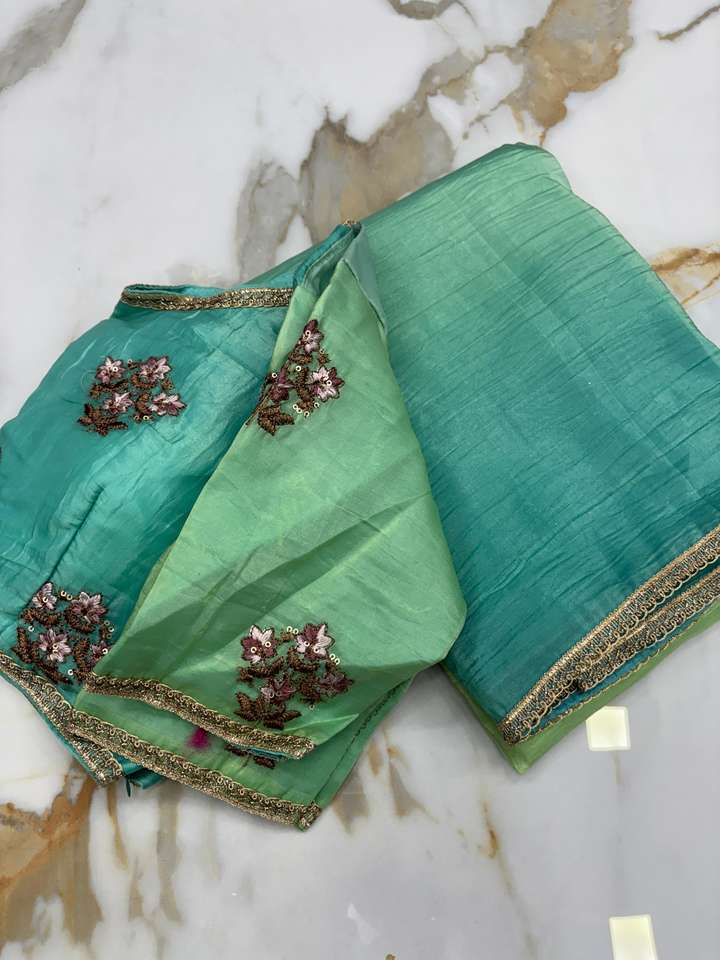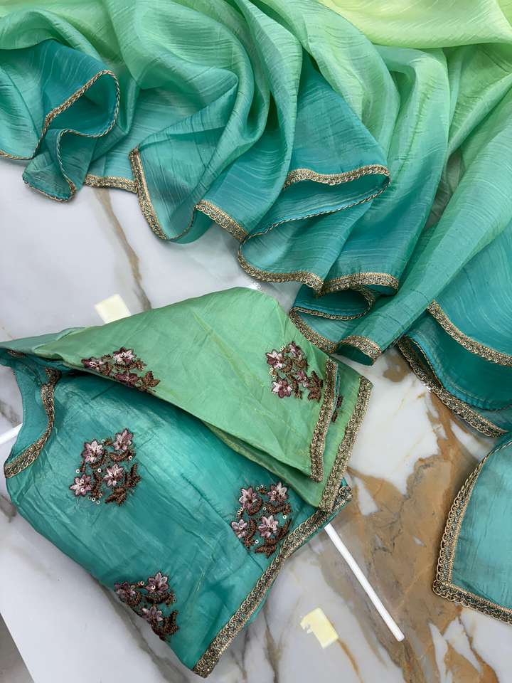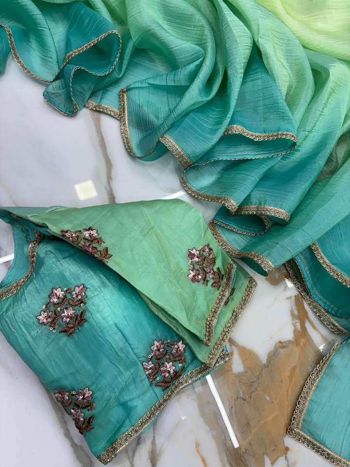 Stitched blouse Sari EMBROIDERY lace border Bollywood Style Wedding Sangeet Party Stunning Look 2025 Indian Mehendi Green Saree