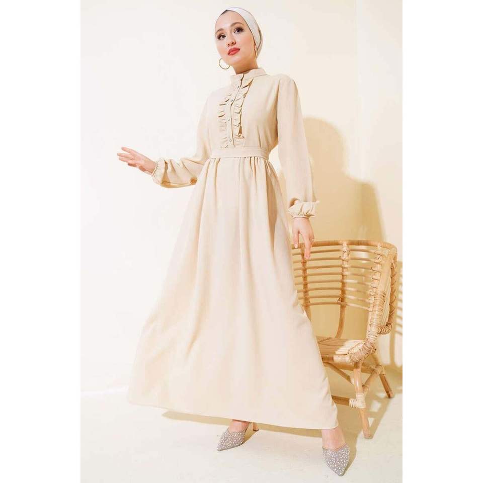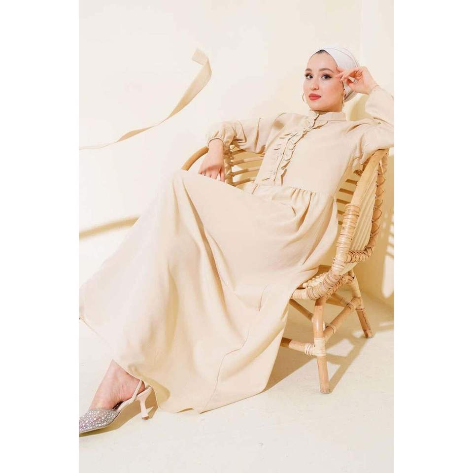 Stone Buttoned Ruffle Dress Beige