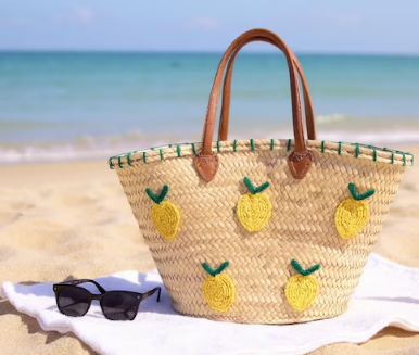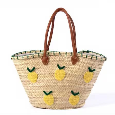 Straw Tote Bag with Lemon Design Handmade Moroccan Basket Bag