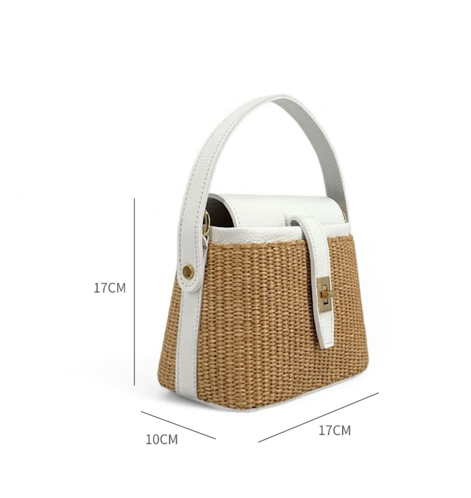 Straw woven beach bag, fashionable woven straw bucket bag, luxurious leather women's handbag
