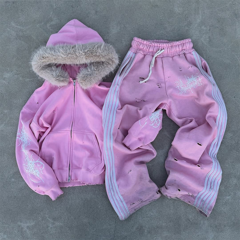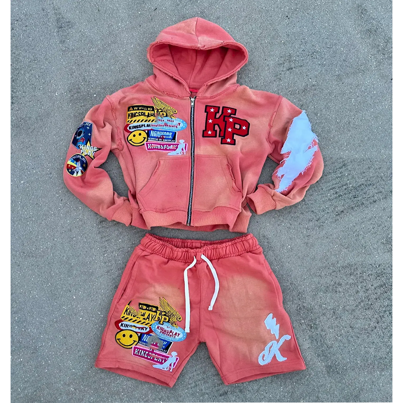 Streetwear 500 Gsm French Terry Zip up High Quality Cotton tracksuit Sweatshirt Heavyweight Embroidery Acid Wash hoodie set