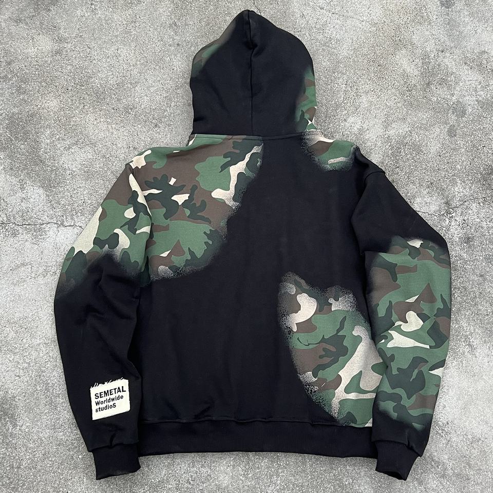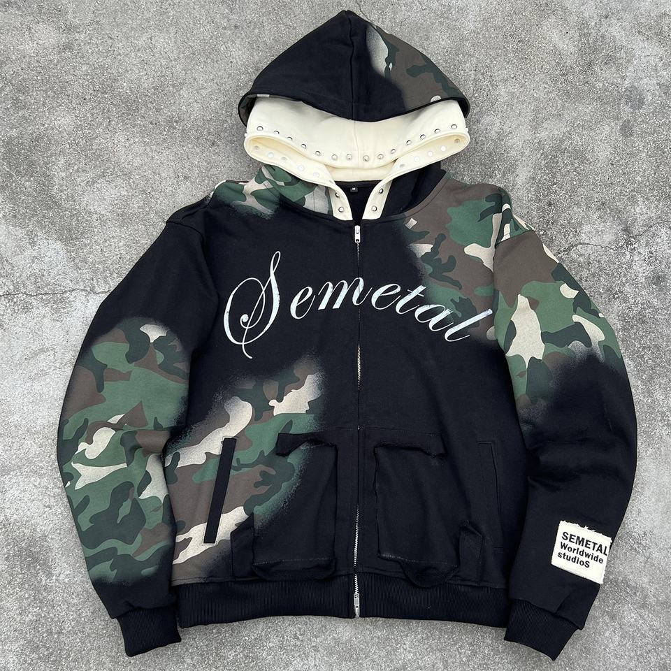 Streetwear Embroidery Printed Double Zipper Hoodie French Terry Double Hooded Hoodie Rhinestone Camo Oversized Zip Up Hoodie