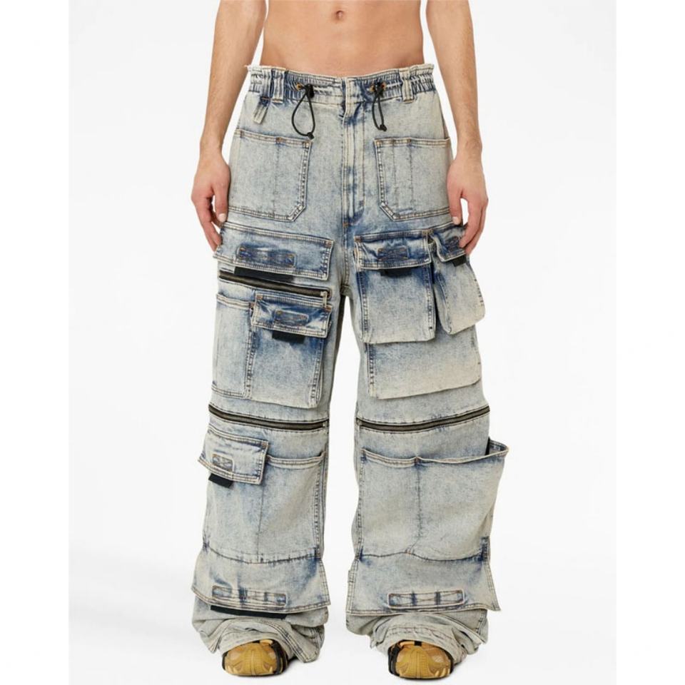 Streetwear Manufacturers Baggy Jeans Men Light Blue Multiple-pocket Drawstring Jeans Men