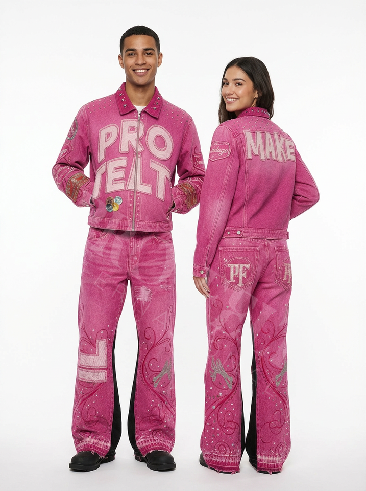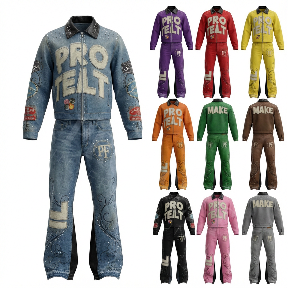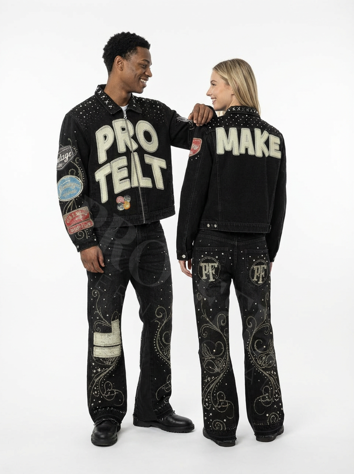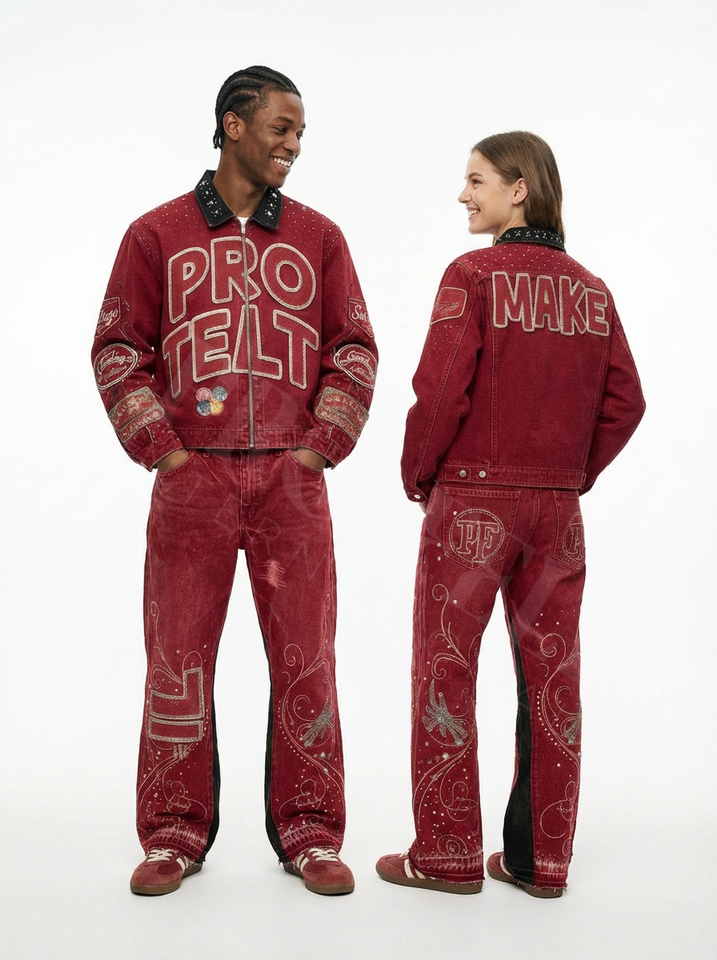 Streetwear Outerwear Vintage Denim Breathable Print Tracksuit Decorative Embroidery Studded Design 100% Cotton Custom OEM ODM