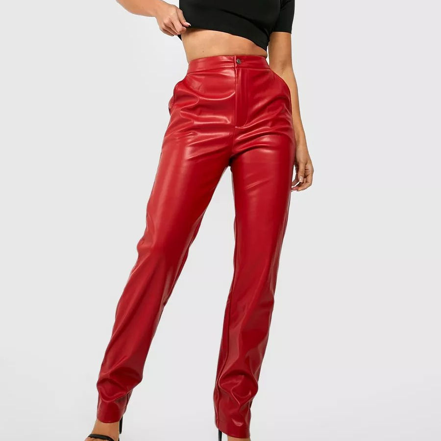 Streetwear Red Color Waistband High Waist Pu Faux Leather Ladies Wide Leg Pants Loose Women Trouser With Zipper
