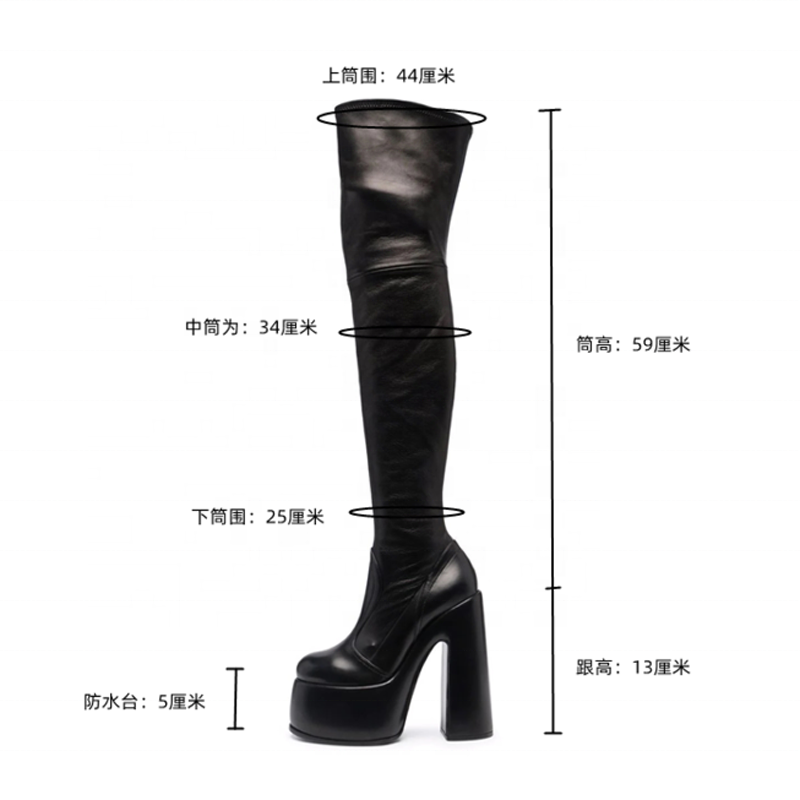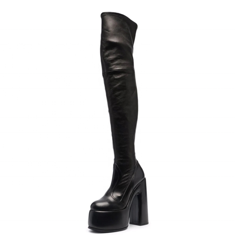 Stretch Long Round Toe Block High Heels Shoes Boots Ladies Thick Bottom Leisure Over Knee High Women Platform Booties