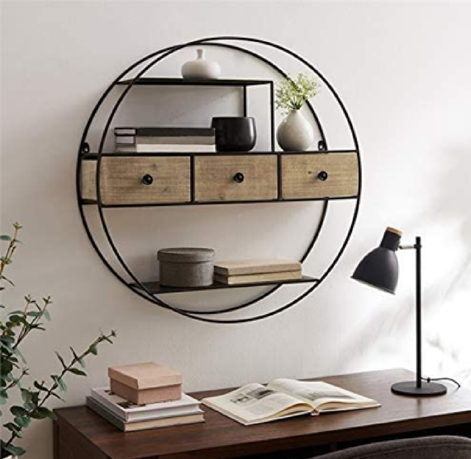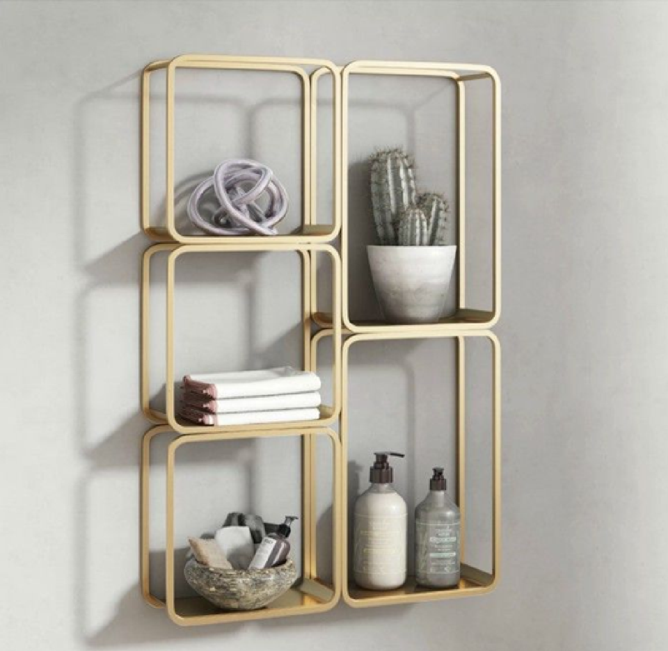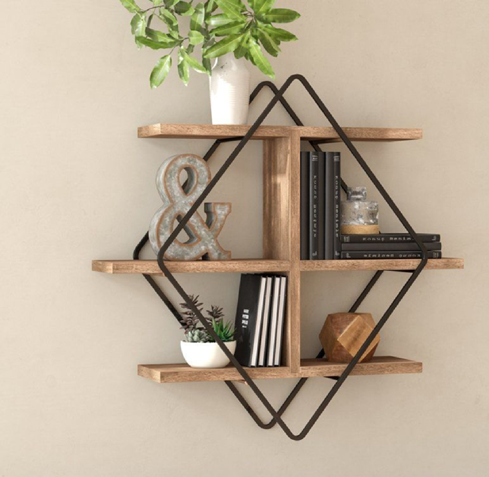 Striking diamond-shaped wood & metal wall shelf, a modern statement piece. Available at wholesale prices.