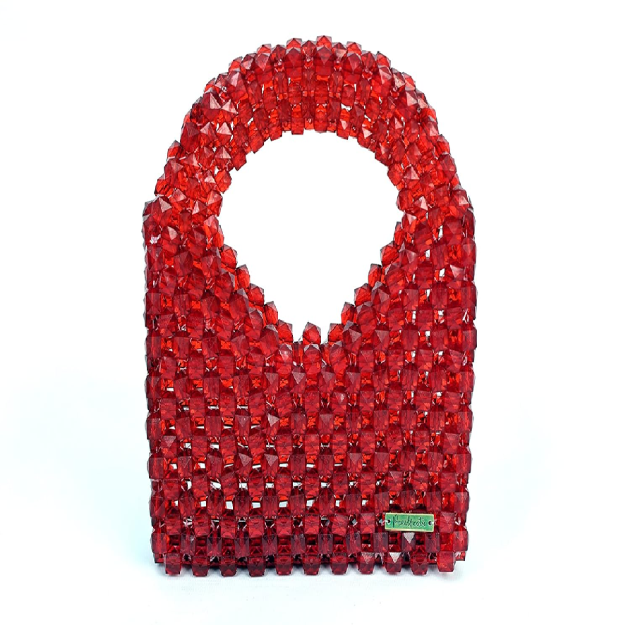 Striking red faceted crystal beaded tote, distinctive U-handle, luxurious bold elegance, handcrafted design at wholesale price.