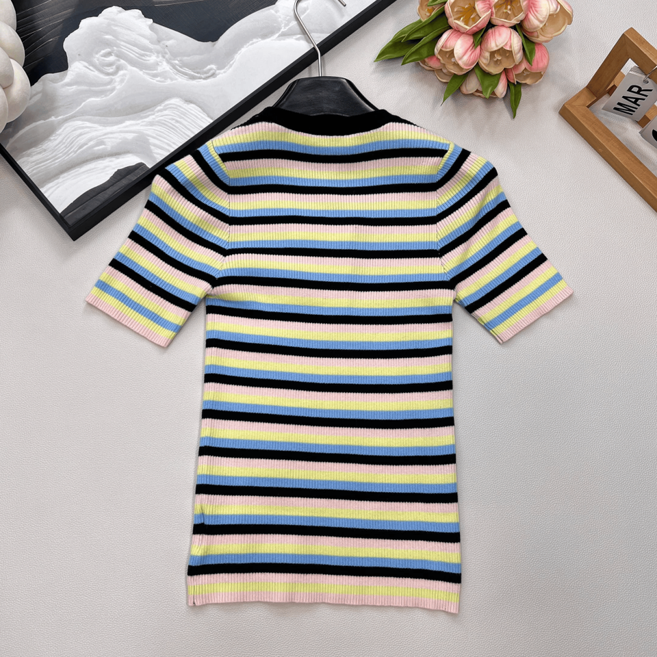 Women Multicolor Stripe Ribbed Knit T Shirt with Chest Cutout Short Sleeve Casual Top
