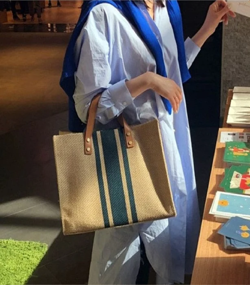 Striped woven rope tote bag with classic black and white horizontal bands, brown leather straps available at wholesale prices.
