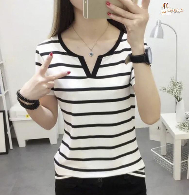 Stripes Womens T-Shirt V Collar T Shirts Skinny Half Sleeve Clothes Women Slim Under Wear Tshirt Casual Top Tees for Female
