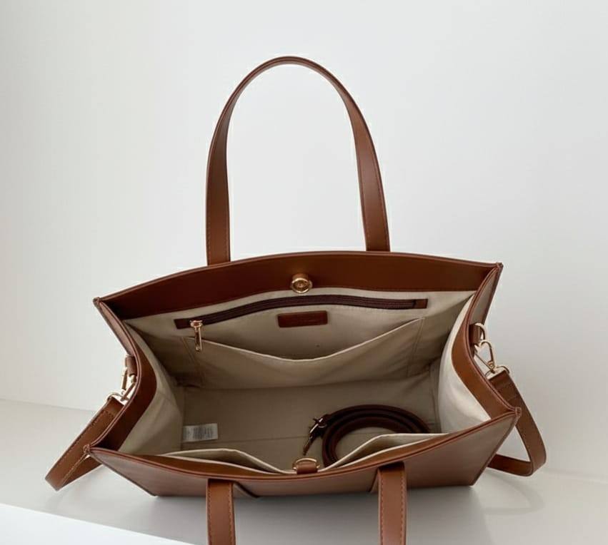 Structured Brown Genuine Leather Vintage Fashion Tote Bag Women Work Satchel Handbag ZIP Water Resistant Strap Minimalist Office