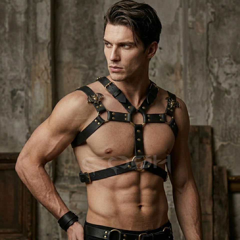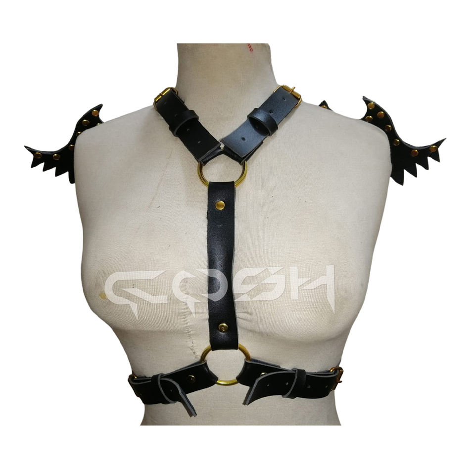 Studded Black Leather Body Harness Small Bat Wing Shoulder Straps with Gold Buckles