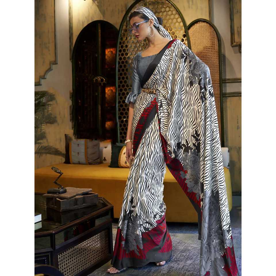Stunning Black and White Printed Satin Party Wear Saree with Blouse Empire Waistline for Formal Evenings and Evening Parties
