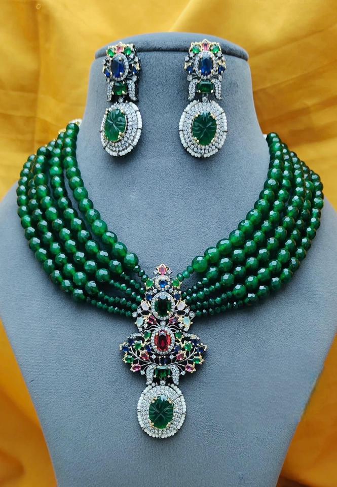 Stunning Five Layer Pendent Necklace Set With Earrings Beautiful AD Stones And Pearls Look Necklace for Party Wear For Women