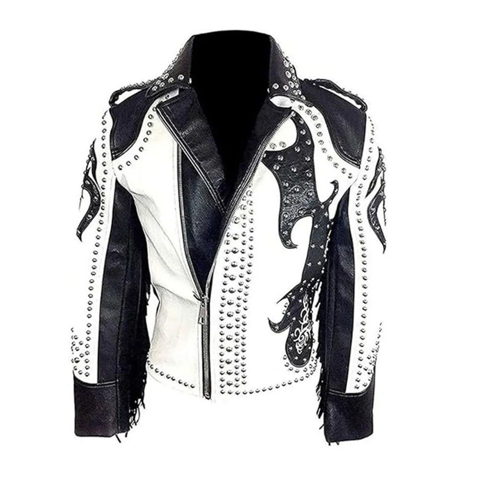 Stunning Gothic Punk Black Leather Jacket for Men Rock Punk Gothic Rivet Biker Leather Jacket with Fringe Jacket for Man