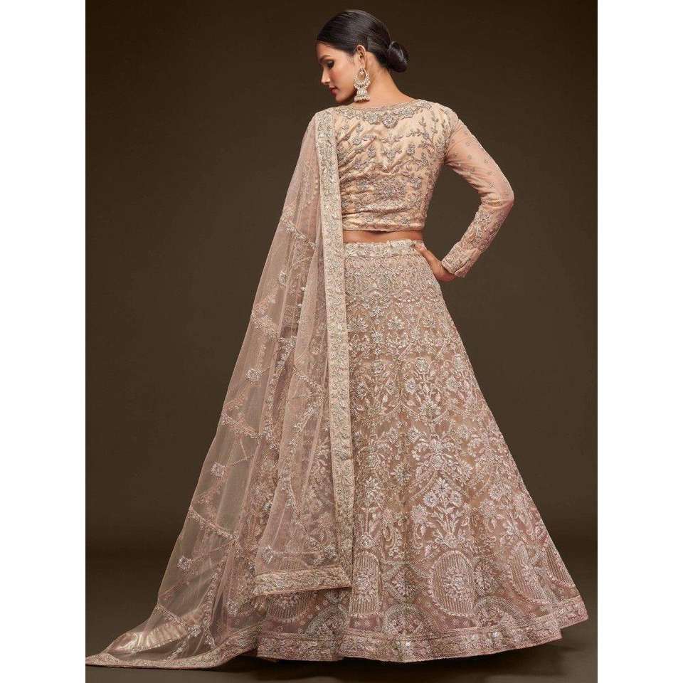 Stunning Royal Beige Embroidered Soft Net Lehenga Choli With Dupatta