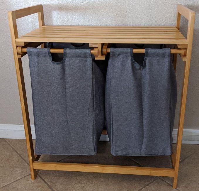 Sturdy Freestanding Bamboo Double Laundry Organizer Hamper with Removable Storage Sorter Bags for Bathroom