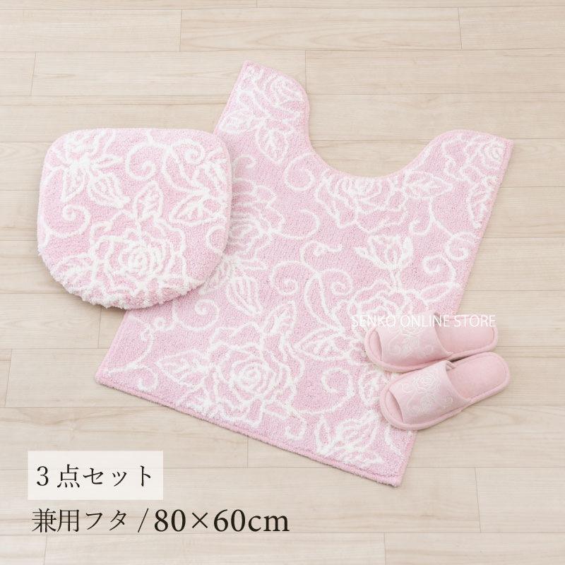 Stylish 3-Piece Bathroom Set Long Clear Rose Floral Pattern Pink Toilet Mat with Compatible Lid Cover Slippers Quality Product